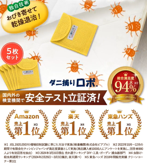 「ダニ捕りロボ」は公的機関での効果実証・第三者試験済で、安心して使えることが大きな魅力です。無臭で薬剤不使用なのも人気の理由です。